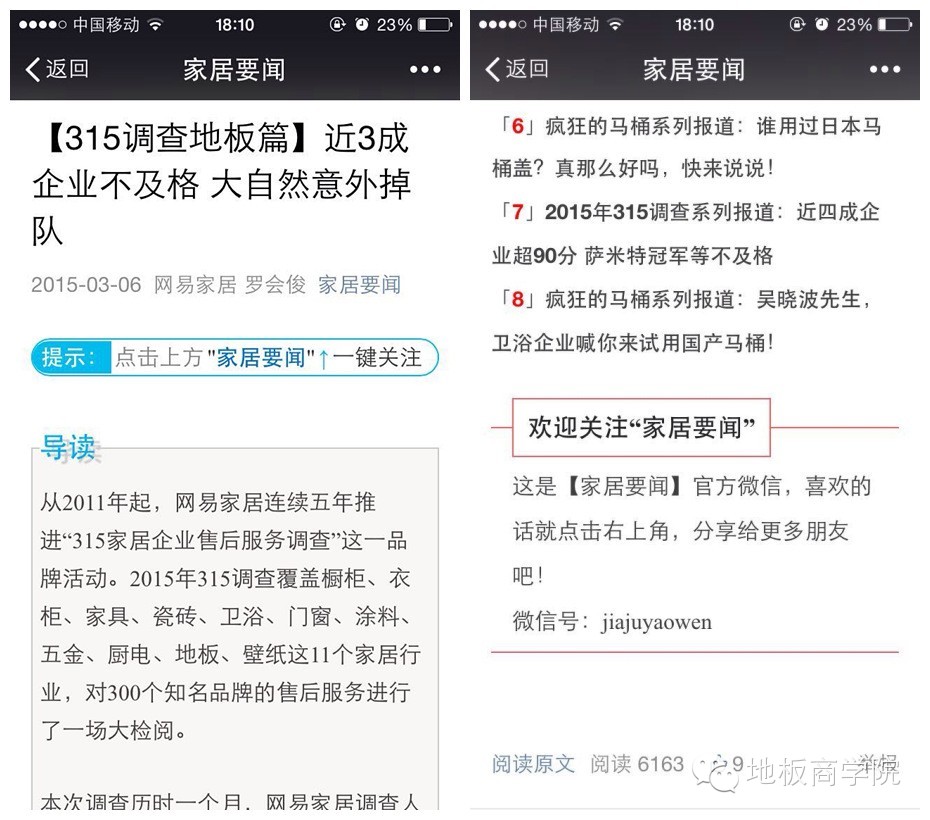 2、3月12日浙江省消费者权益保护委员会公布了15个批次地暖专用地板的检测结果,曝光了其中13个品牌的地暖专用地板在模拟地热环境情况下(40℃)甲醛释放量超过国家标准,其中,“大自然”浸渍纸层压木质地板的甲醛释放量达到9.4毫克/升,超过国家标准6.3倍;该篇新闻在网上进行了更为疯狂的传播,据统计不下100个微信订阅号对事件进行了报道,预测总阅读量超过了10万,地板行业第一新媒体——地板商学院对于该事件在3月14日也进行了报道,阅读量也达到了近6万。