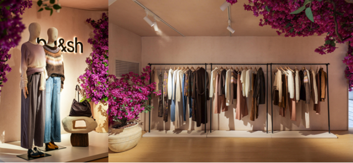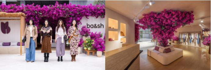 ba&sh于限时空间中巧妙构筑出一座流动的南法艺术之境。细腻温润的墙面与蔓延的紫色九重葛交织成诗意画卷,休闲咖啡区坐落其间,重现普罗旺斯夏日的静谧光景。当南法旧梦氛围渐浓,新季时装秀也随之优雅启幕——真丝丝绒裙摆轻盈曳动,羊绒针织流转暖意,于模特从容步履间渐次呈现,在细腻光影中勾勒出属于现代女性的法式松弛美学。这不仅是一场对新品的生动解读,更是一次对品牌“自由生长”理念的沉浸式表达。