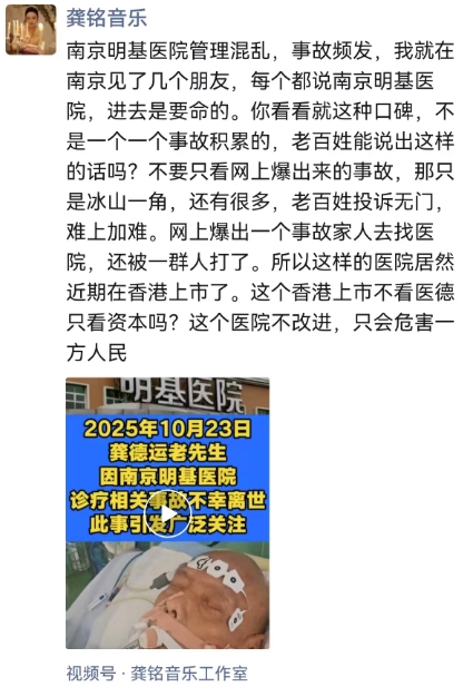 我国著名歌唱家龚铭父亲因南京明基医院误诊去世 实名控诉该医院